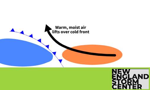 Other modes of lift include convergence (when winds around an area of low pressure come together), orographic (when winds run into terrain, such as a mountain, and are forced to rise over the mountain; this is another common mode of lift in New England among the mountains in the north) and convectional (which comes from uneven heating of the ground during the day).